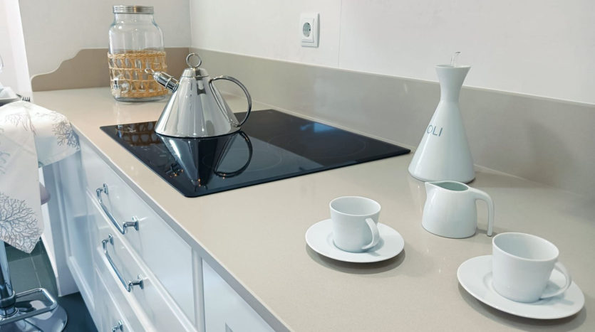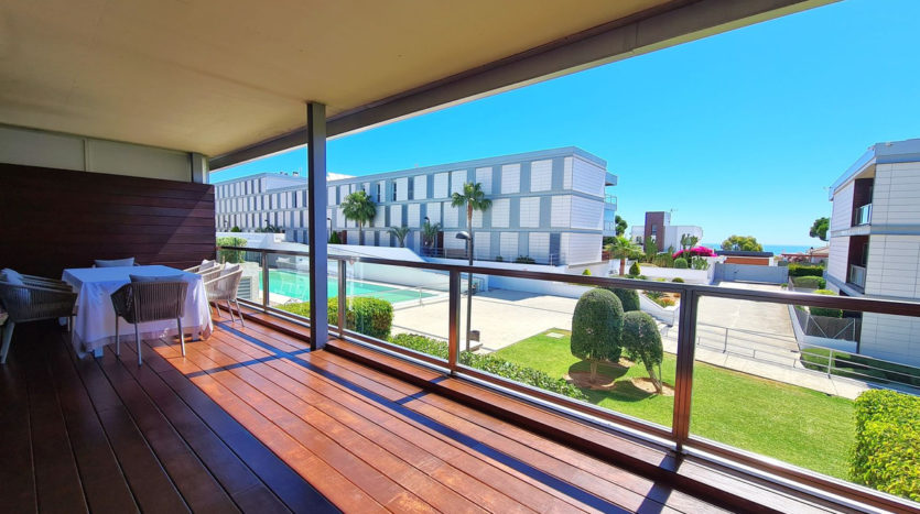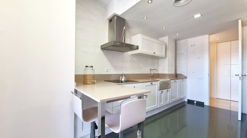 Am Eingang der Wohnung befindet sich ein Flur mit einem großen Einbauschrank, der mit dem **großen Wohnzimmer verbunden ist und Zugang zur großen überdachten Terrasse mit teilweisem Meerblick** bietet. Es verfügt über eine geräumige, voll ausgestattete, separate Küche mit hochwertigen Geräten und einer separaten Waschküche.