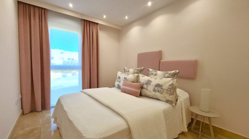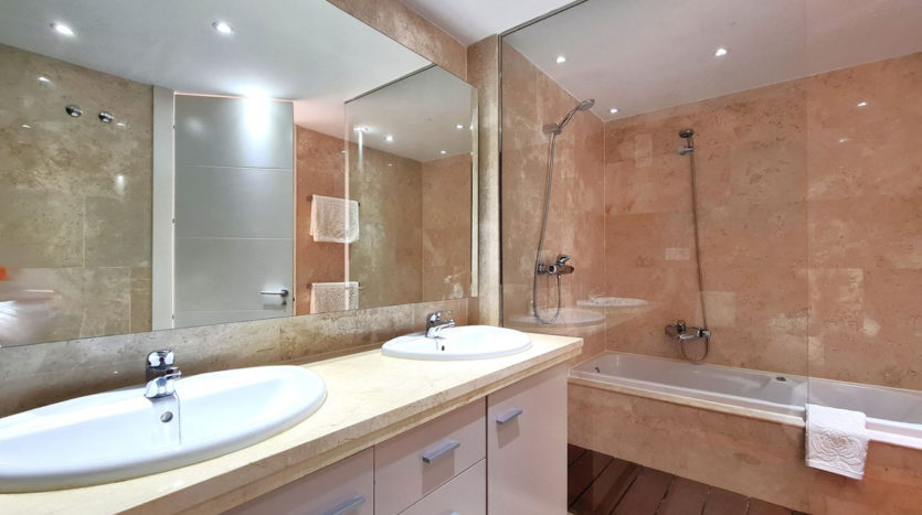 Die Schlafzimmer der Wohnung sind entlang des Flurs verteilt, wo sich auch zwei komplette Badezimmer befinden – eines mit Dusche und das andere mit Badewanne. Die Gästezimmer sind geräumig und verfügen über Einbauschränke sowie große Fenster mit Blick auf den Garten. Das Hauptschlafzimmer besitzt einen begehbaren Kleiderschrank und ein eigenes Badezimmer mit Dusche und Whirlpool-Badewanne.