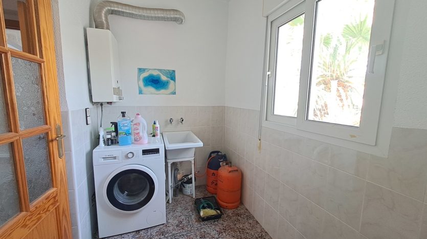 Wir präsentieren Ihnen eine attraktive Villa in **Villamartín**. Beim Betreten der Immobilie gelangen Sie zunächst in ein großzügiges Wohnzimmer mit Kamin, das nahtlos in den Essbereich übergeht. Von dort aus führt der Weg in eine offene Küche mit angrenzendem Hauswirtschaftsraum.