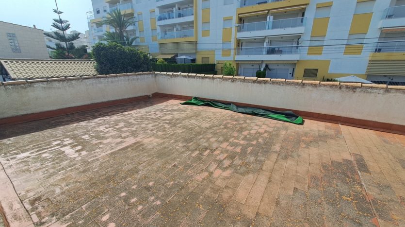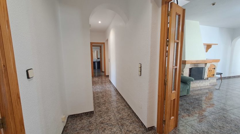 Ein langer Flur verbindet vier der Schlafzimmer, die jeweils über Einbauschränke verfügen, sowie zwei Badezimmer – eines davon mit Badewanne. Im Obergeschoss befindet sich das fünfte Schlafzimmer sowie eine große Sonnenterrasse (Solarium) mit herrlichem Meerblick. Die Lage dieser Immobilie ist ideal: Zahlreiche Bars, Geschäfte und Supermärkte sind bequem zu Fuß erreichbar. Zudem befinden sich die renommierten Golfplätze **Campoamor** und **Las Ramblas** nur etwa zehn Gehminuten entfernt.