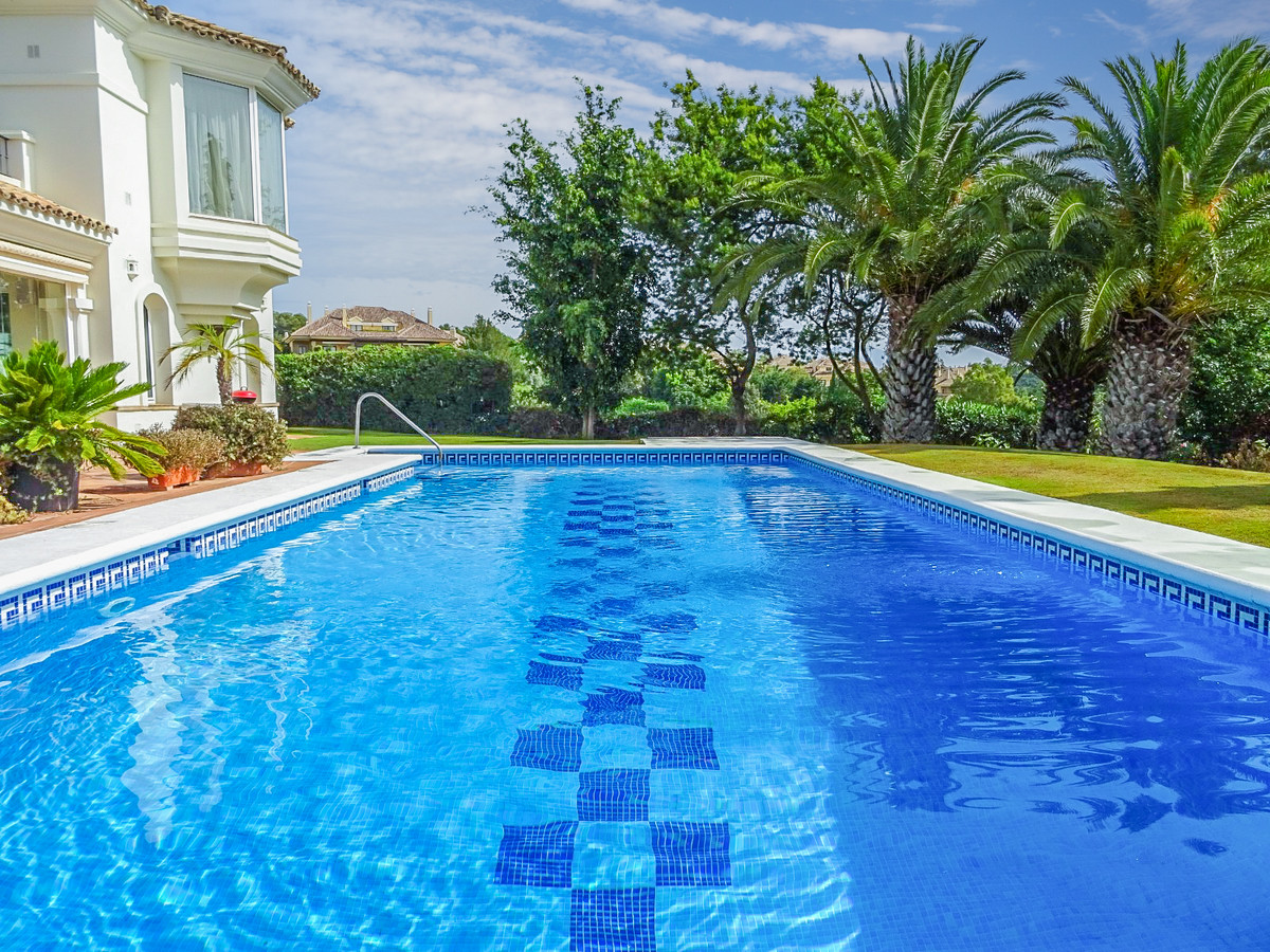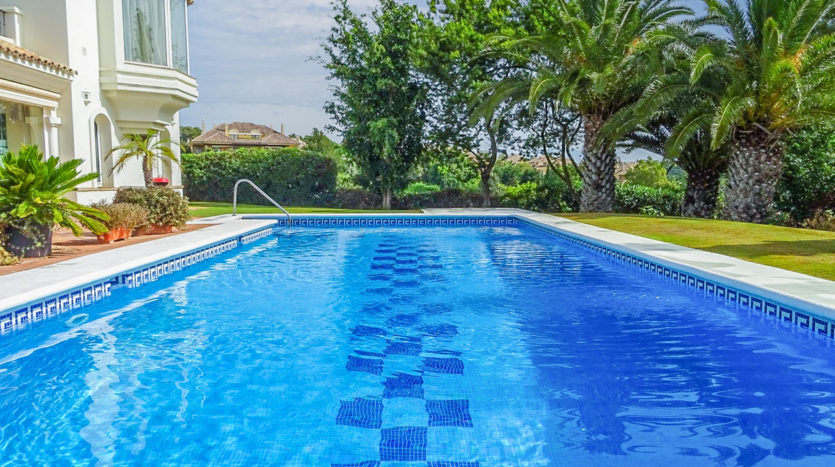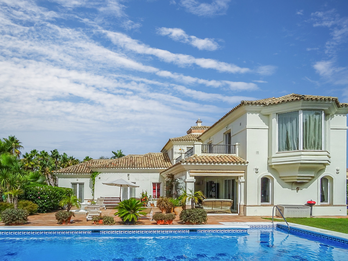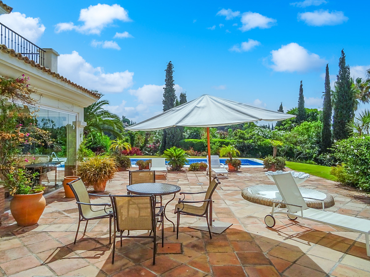 Der Außenbereich bietet einen großen Pool, gepflegten Garten und viel Privatsphäre. Das Hauptschlafzimmer verfügt über eine eigene Terrasse und ein Ankleidezimmer. Hochwertige Ausstattung wie Fußbodenheizung, Klimaanlage und Doppelverglasung sorgen für Komfort. Zudem gibt es einen Abstellraum, eine Doppelgarage und zusätzliche Parkplätze. Die 2002 erbaute Villa befindet sich in ruhiger Lage, nahe Golfplätzen und nur 10 Minuten vom Strand entfernt – ein echtes Schmuckstück in Sotogrande.