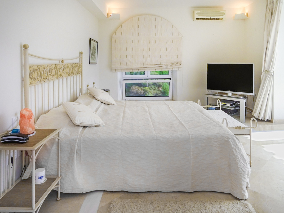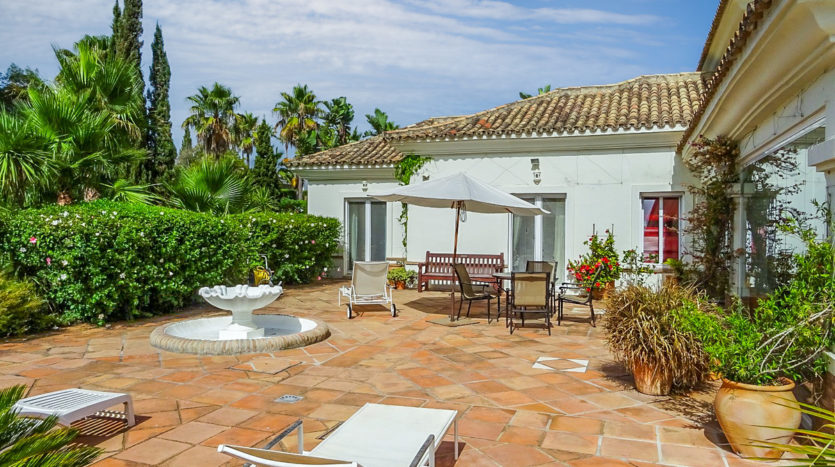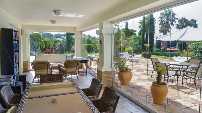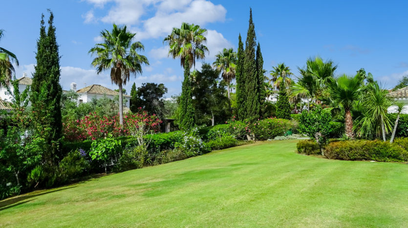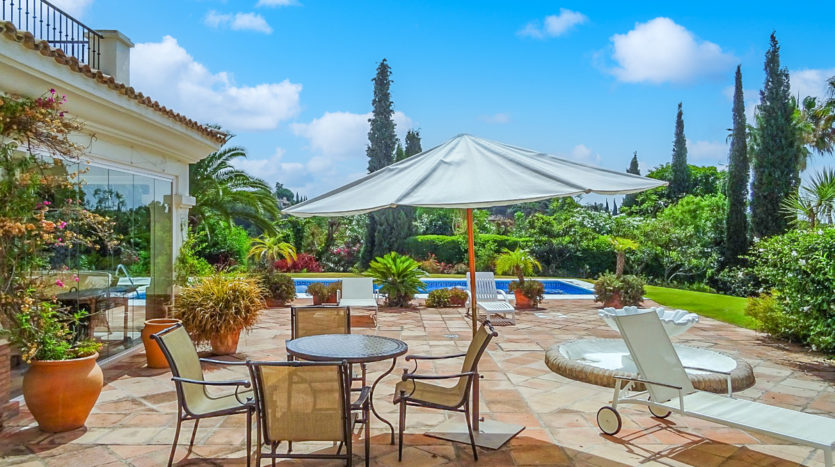 Der Außenbereich bietet einen großen Pool, gepflegten Garten und viel Privatsphäre. Das Hauptschlafzimmer verfügt über eine eigene Terrasse und ein Ankleidezimmer. Hochwertige Ausstattung wie Fußbodenheizung, Klimaanlage und Doppelverglasung sorgen für Komfort. Zudem gibt es einen Abstellraum, eine Doppelgarage und zusätzliche Parkplätze. Die 2002 erbaute Villa befindet sich in ruhiger Lage, nahe Golfplätzen und nur 10 Minuten vom Strand entfernt – ein echtes Schmuckstück in Sotogrande.