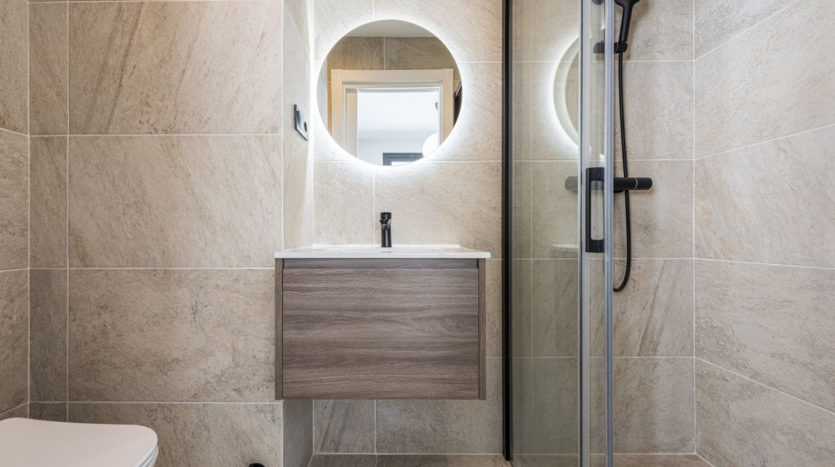 - Drei elegant gestaltete Badezimmer mit Fußbodenheizung
