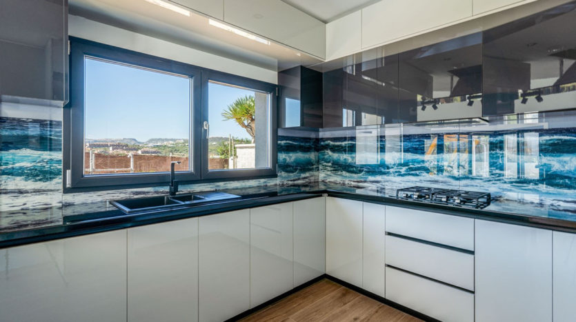 Die untere Etage bietet zwei Schlafzimmer und ein voll ausgestattetes Badezimmer, während das Obergeschoss das großzügige Hauptschlafzimmer mit Zugang zu einer großen Dachterrasse umfasst. Die offene Gestaltung im Erdgeschoss fördert das gesellige Beisammensein.