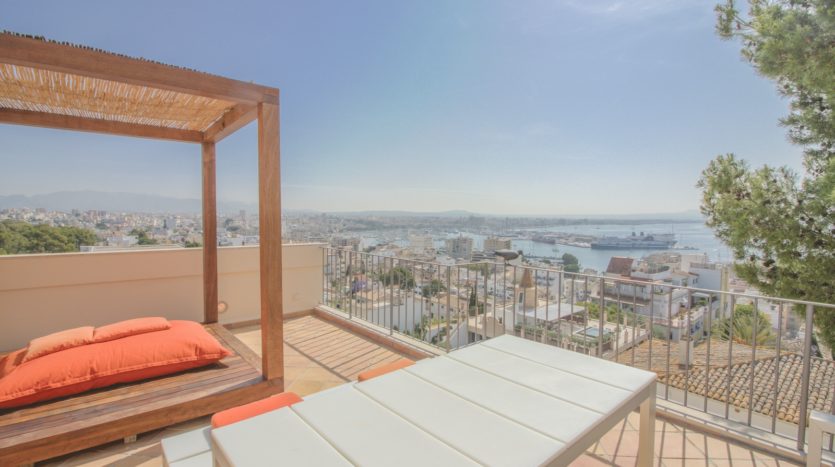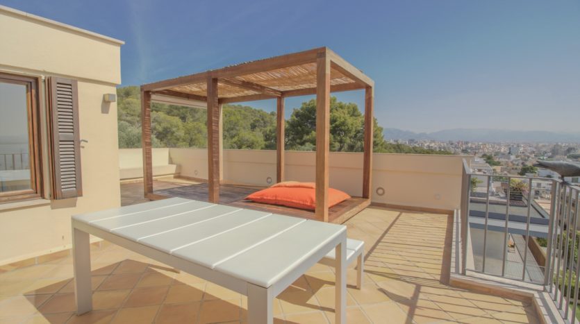 Die oberste Etage beherbergt eine elegante Lounge mit Panoramafenstern von Boden bis zur Decke und einem Kamin, der einen ruhigen Raum mit außergewöhnlichem 360-Grad-Blick schafft. Dieser Raum kann auch als zusätzliches Schlafzimmer oder Gästesuite genutzt werden. Von der Lounge aus gelangt man auf die beeindruckende Dachterrasse, die einen vollständigen Blick über Palma, das Meer, den Bellver Park und die Dächer der Stadt bietet – der perfekte Ort zum Entspannen oder für private Zusammenkünfte.