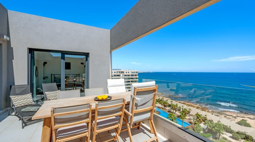 Wir freuen uns, Ihnen dieses beeindruckende Penthouse in erster Meereslinie präsentieren zu dürfen. Es befindet sich in der obersten Etage und bietet einen spektakulären, freien Blick auf das Mittelmeer. Von hier genießen Sie eine wahrhaft privilegierte Perspektive auf einige der schönsten Küstenabschnitte Spaniens. Der Strand liegt direkt vor Ihrer Haustür, während Restaurants, Geschäfte und alle wichtigen Annehmlichkeiten nur wenige Gehminuten entfernt sind.