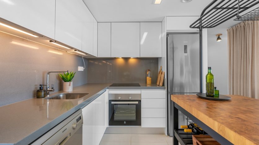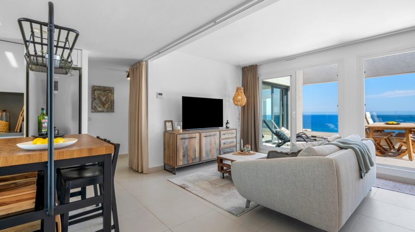 Der Eingangsbereich führt Sie direkt in das Herz des Zuhauses: ein heller, offener Wohn- und Küchenbereich, der dank großer Fenster von beiden Seiten mit natürlichem Licht durchflutet wird. Die voll ausgestattete Küche lässt keine Wünsche offen – ob für ein romantisches Dinner zu zweit oder ein Essen mit Freunden und Familie. Vom Wohnzimmer aus gelangen Sie auf die großzügige, nach Osten ausgerichtete Terrasse mit unvergleichlichem Meerblick – ideal für gesellige Runden, Sonnenbaden oder um in absoluter Privatsphäre dem beruhigenden Klang der Wellen zu lauschen. Zusätzlich gibt es einen westlich ausgerichteten Balkon, perfekt um bei einer Tasse Tee und einem guten Buch den Sonnenuntergang zu genießen. Dank der verglasten Fassade ist dieser Bereich auch im Winter wunderbar nutzbar.