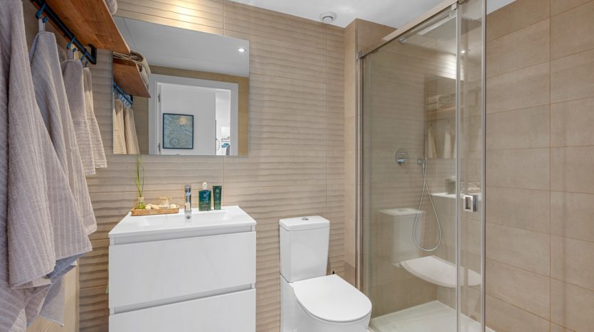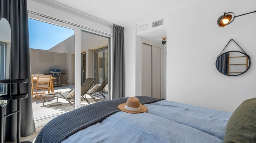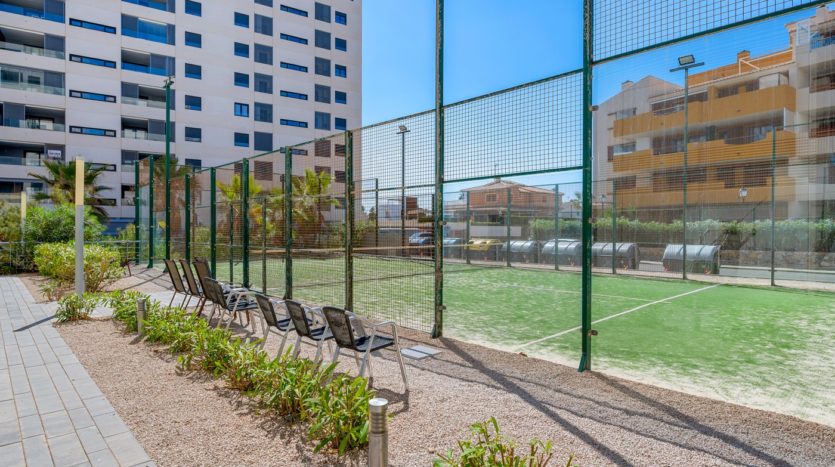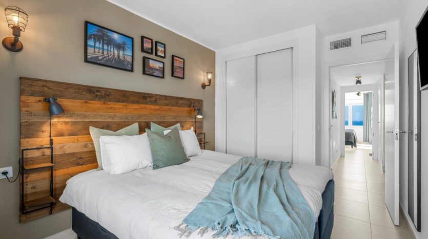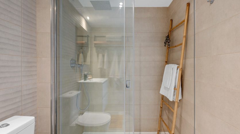 Das Penthouse wird komplett möbliert verkauft, mit stilvollen, hochwertigen Möbeln und eleganten Holzakzenten. Die Wohnanlage selbst bietet mehrere Swimmingpools (einer davon beheizt), einen Padelplatz sowie eine Poolbar für die Sommermonate.