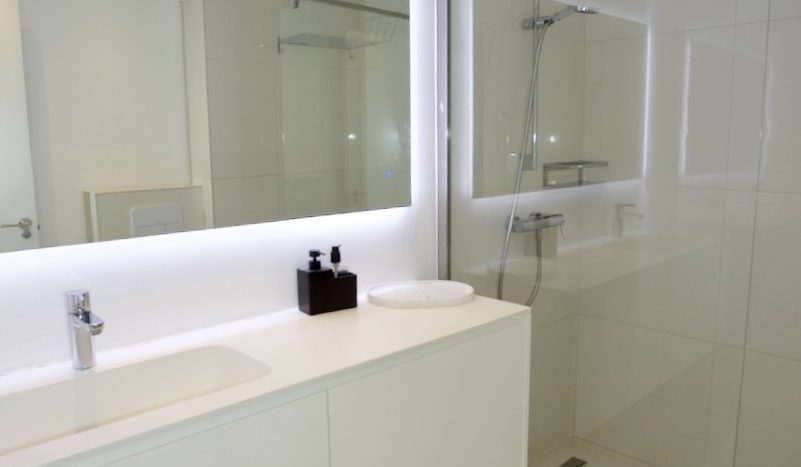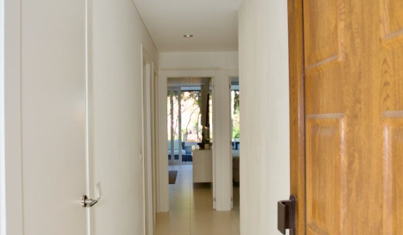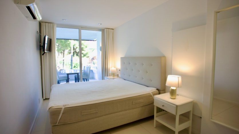 Beim Betreten des Anwesens gelangen Sie in den Flur, von dem aus Sie alle einzelnen Räume der Wohnung erreichen. Das große Hauptwohnzimmer ist mit der offenen Küche verbunden und bietet direkten Zugang zur Terrasse mit Tisch und Sitzecke mit Blick auf den Pool, den angelegten Garten und den Yachthafen. Das Hauptschlafzimmer verfügt über ein Doppelbett und eine Schiebetür zur überdachten Terrasse. Das andere Schlafzimmer, das über einen internen Flur vom Wohnbereich aus zugänglich ist, verfügt über zwei Einzelbetten und ein Fenster. Im Flur befinden sich auch die beiden separaten Badezimmer.