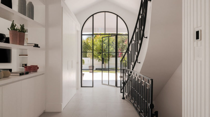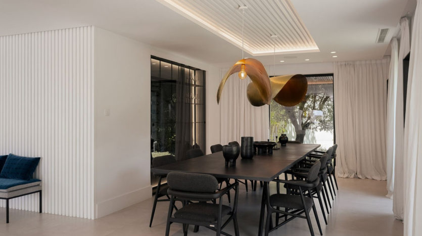 Auf drei Ebenen verteilt, umfasst das Hauptgeschoss eine offene Küche mit Kochinsel und Siemens-Geräten, einen Essbereich sowie ein L-förmiges Wohnzimmer mit Einbauregalen und Fernseher. Zwei Schlafzimmer mit eigenem Bad und ein Gäste-WC vervollständigen das Layout. Schwarz gerahmte Fenster öffnen sich weit, um Innen- und Außenbereiche zu verbinden. Weiß gestrichene Holzdecken verleihen Wärme, schmiedeeiserne Geländer setzen Akzente. Das Wohnzimmer öffnet sich zu einer überdachten Terrasse mit Pool. Weiter im Garten befindet sich eine schattige Außenküche mit Essbereich.