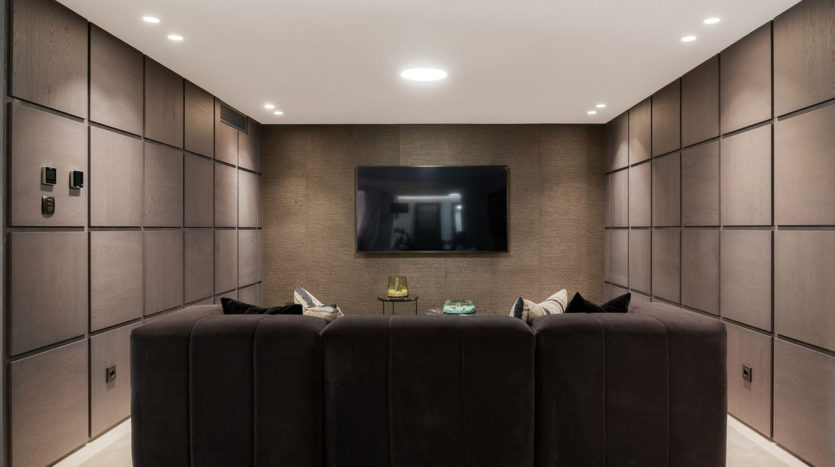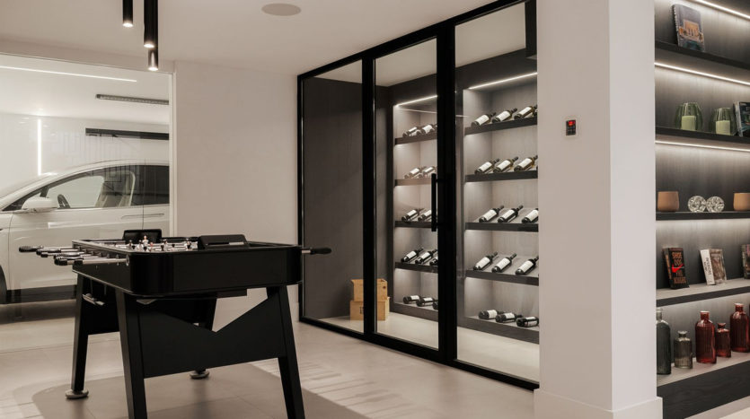 Im Untergeschoss befinden sich ein Spielbereich mit Billardtisch, Weinkeller, Bar, Kinoraum und Fitnessraum. Zwei Schlafzimmer mit eigenem Bad, ein Gäste-WC, Waschraum, Abstellraum sowie eine überdachte Garage mit 69 m². Ein gepflasterter Innenhof bietet zusätzliche Parkmöglichkeiten auf dem Grundstück.
