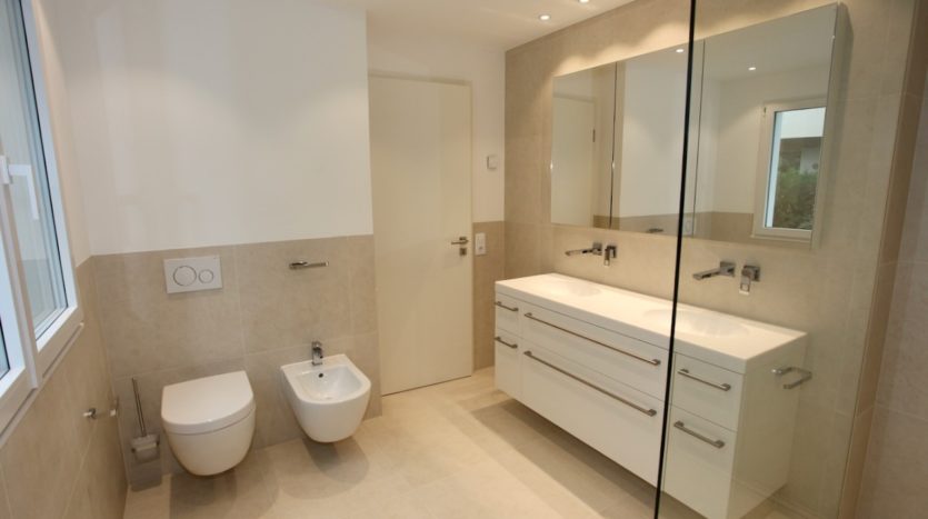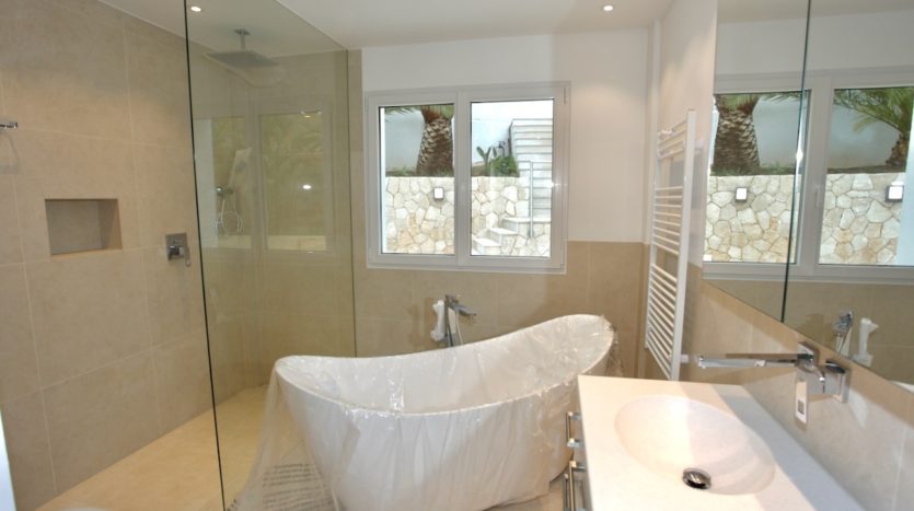 Die Villa bietet vier elegante Schlafzimmer, jeweils mit eigenem Bad, darunter eine beeindruckende Hauptsuite mit Designer-Badezimmer und großzügiger ebenerdiger Dusche. Im Erdgeschoss befindet sich ein zweiter Wohnbereich mit direktem Zugang zu einer großzügigen Terrasse, ergänzt durch einen separaten Hauswirtschaftsraum und ein Gäste-WC.