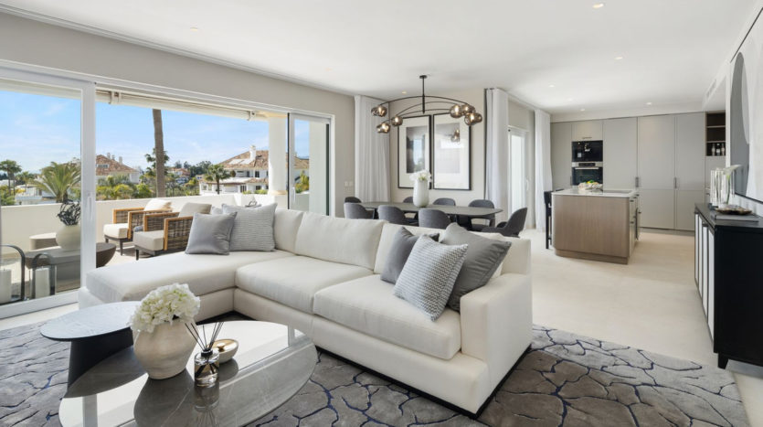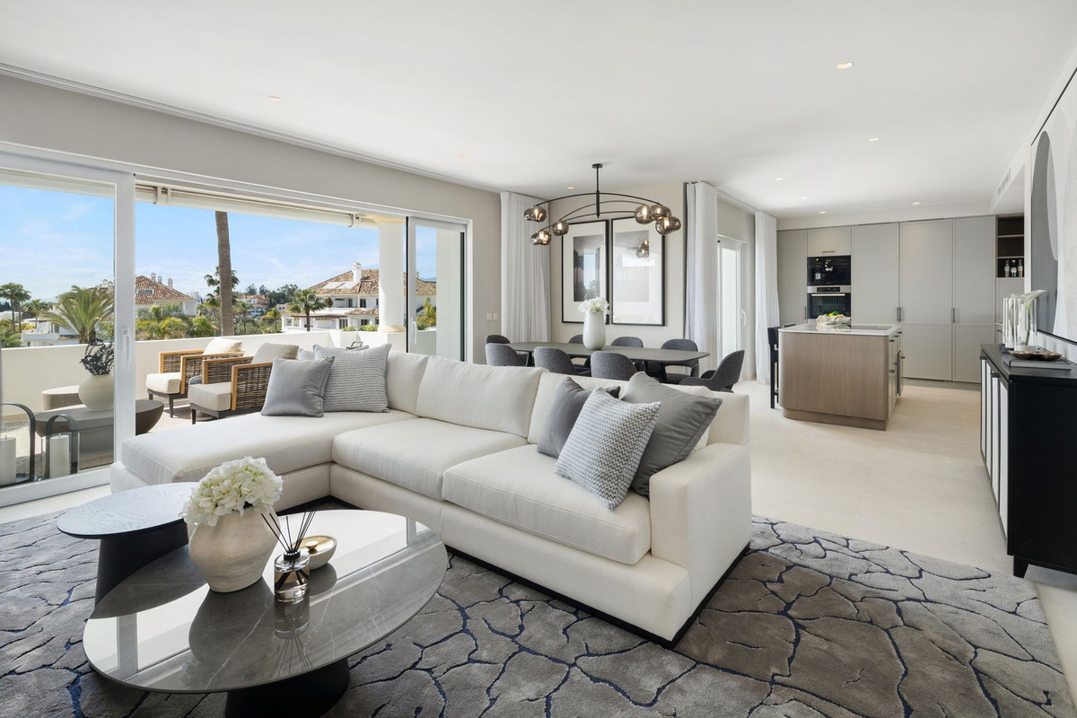 Der offene Grundriss verbindet Küche, Ess- und Wohnbereich zu einem harmonischen Ganzen. Die hochwertige Ausstattung mit modernsten Geräten, maßgeschneiderten Möbeln und einem markanten geschwungenen Küchenblock verleiht der Immobilie ein besonders elegantes Ambiente. Mehrere private Terrassen bieten herrliche Ausblicke auf die gepflegten Gartenanlagen und teilweise auf das Meer – ideal, um die Ruhe und das Klima Marbellas zu genießen.