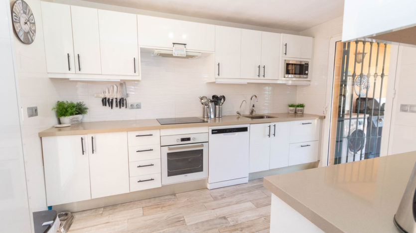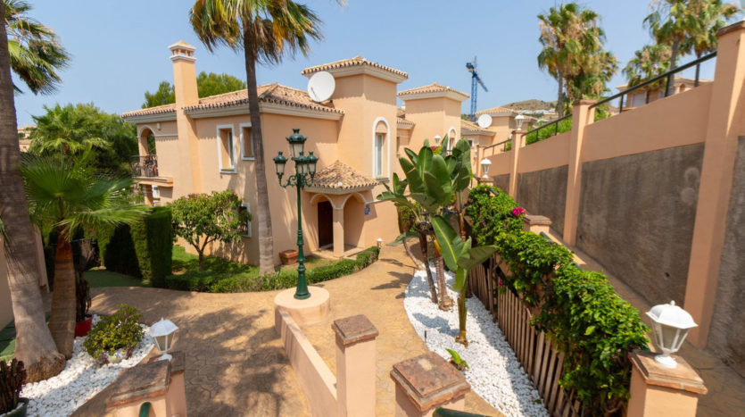 Südwestlage, makellos präsentiert, 3 Doppelzimmer, Doppelhaushälfte mit Blick vom Obergeschoss auf das Mittelmeer, gelegen in einer kleinen, äußerst gepflegten Wohnanlage. Die Immobilie befindet sich in ausgezeichnetem Zustand und wurde kürzlich komplett renoviert. Dieses schöne Haus bietet sowohl geräumige Wohnbereiche im Inneren als auch Terrassen im oberen und unteren Bereich sowie einen Garten, um das Leben im Freien zu genießen. Beim Betreten der Immobilie führt ein einladender Flur zu einem geräumigen Wohnzimmer mit Kamin, einem Essbereich, einer voll ausgestatteten modernen Küche mit viel Tageslicht und einem Außenbereich für Hauswirtschaftsarbeiten. Das Wohnzimmer führt auf eine großzügige Terrasse im unteren Bereich und bietet Zugang zum Garten, der auch über einen unteren Abstellraum verfügt.