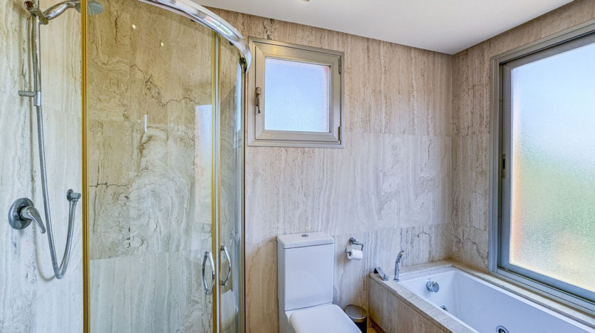 Das Haus verfügt über private Terrassen und ein Solarium, ideal um die Aussicht zu genießen, sowie eine voll ausgestattete Bosch-Küche mit einer Durchreiche zum Essbereich. Die Master-Suite verfügt über ein eigenes Bad, Einbauschränke und eine private Terrasse mit Meerblick. Zwei weitere Gästezimmer bieten Meer- und Bergblick, während das Untergeschoss als vielseitiger vierter Raum dient, ideal als Studio oder zusätzlicher Wohnraum.