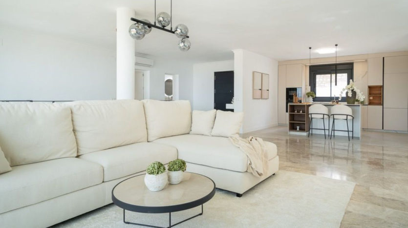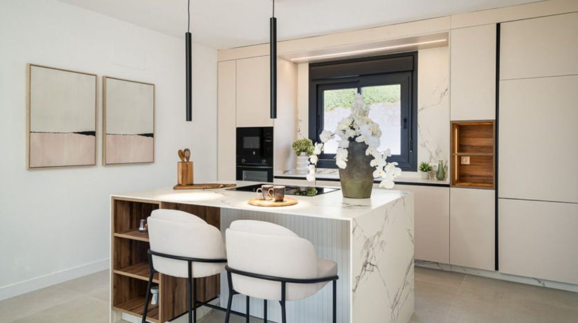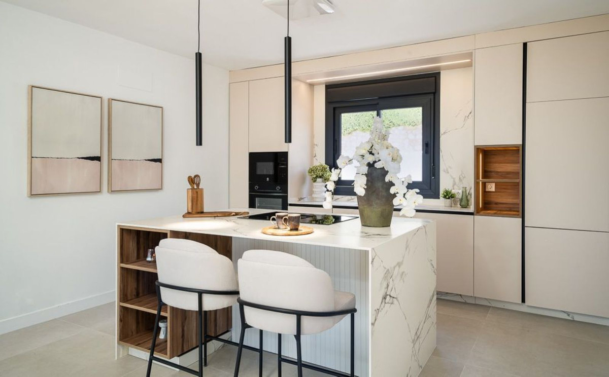 Im Herzen der Villa befindet sich eine hochmoderne Küche mit einer eleganten zentralen Kochinsel, die mit hochwertigen Geräten ausgestattet ist. Die Küche geht nahtlos in einen hellen und luftigen offenen Wohn- und Essbereich über, wo große Fenster den faszinierenden Meerblick einrahmen und den Raum mit natürlichem Licht durchfluten.