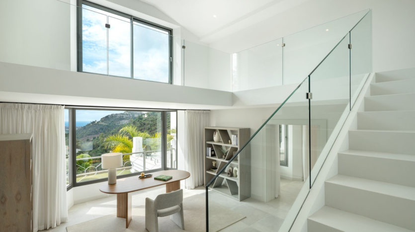 Die obere Etage beherbergt drei weitere Schlafzimmer, alle mit eigenem Bad und Zugang zu privaten Terrassen. Die Master-Suite besticht durch einen Ankleidebereich und ein luxuriöses Bad mit freistehender Wanne.