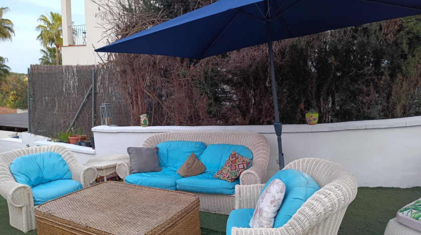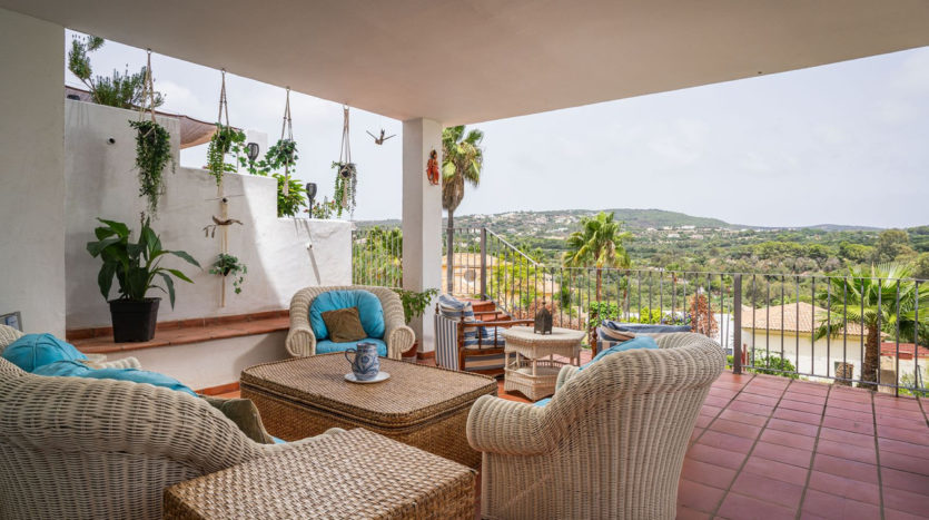 Wir fahren mit einem doppelten Raum fort, der aus Terrassen besteht, mit Tischen und Stühlen in zwei verschiedenen Teilen links und rechts, beide können Sie bei einem Drink genießen und dabei den Panoramablick auf den Golfplatz und die Umgebung genießen.