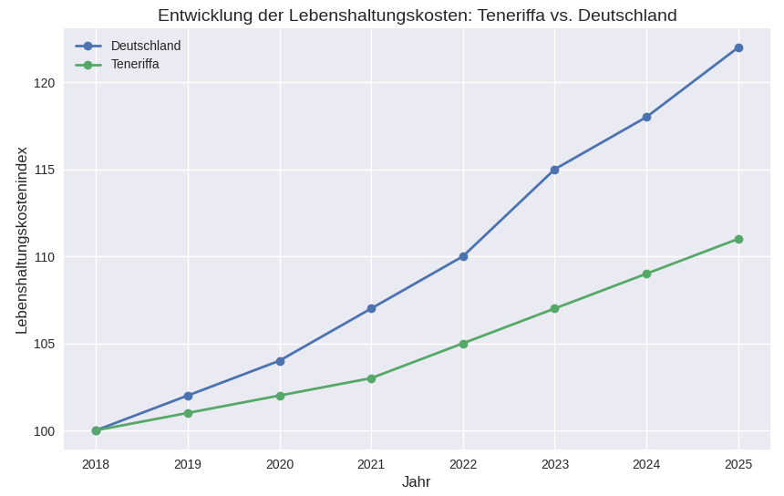 Die tatsächlichen Ausgaben können je nach Region, persönlichem Lebensstil und Auswahl von Wohnort und Services abweichen. Insgesamt sind die Lebenshaltungskosten auf Teneriffa deutlich niedriger als in Deutschland – vor allem Miete, Nebenkosten und Freizeitangebote sind besonders attraktiv.